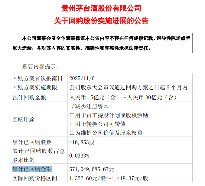 截至2026年1月底,公司已累计回购股份416,853股,占公司总股本的比例为0.0333%,购买的最高价为1,418.37元/股、最低价为1,322.60元/股。