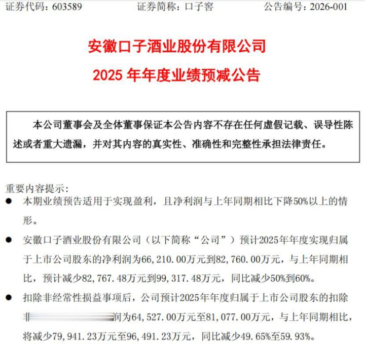 口子窖2025年预计归母净利润为6.62亿至8.28亿元,同比减少50%到60%。这一数据背后,是该公司自2015年上市以来最严峻的业绩寒冬。