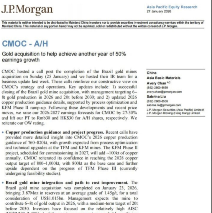 其看多逻辑直击核心:一是黄金业务成新增长引擎,巴西金矿产能叠加高金价,推动估值向全球矿业巨头靠拢;二是铜产量持续上修(2026年预计76-82万吨),依托技术升级有望跻身全球铜生产商第一梯队;三是财务稳健,12亿美元零息可转债降低融资成本,为扩产并购预留空间。报告还指出,市场对巴西金矿成本、刚果金地缘风险的定价过于悲观,公司实际价值仍有释放空间。