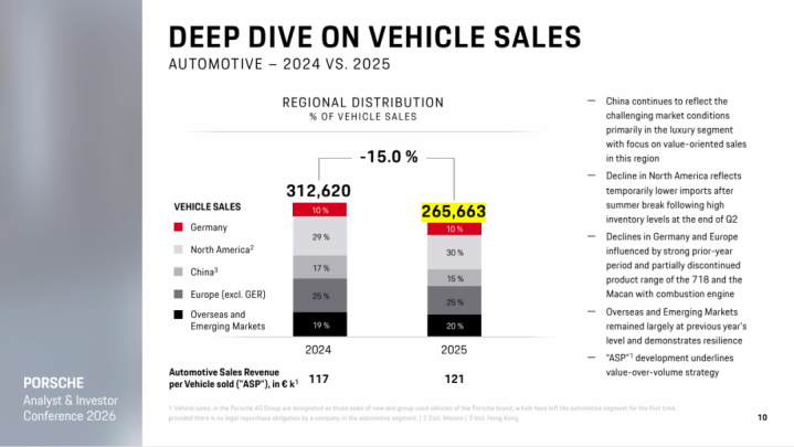 从群众市集来看,保时捷的平均单车销售收入从2024年的11.7万欧元培植至2025年的12.1万欧元,体现了保时捷坚抓“重价值、轻限制”的计策。但是,中国市集2025年销售收入为25.65亿欧元,同比下滑近40%,显贵高于同期销量跌幅,意味着平均单车销售收入较2024年进一步下滑。