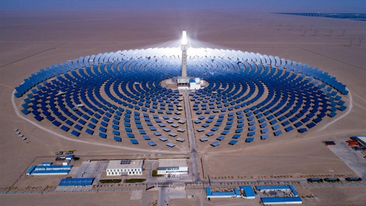这座2018年建成的电站,占地足足7.8平方公里,一眼望不到头,35面凹面镜搭配1.2万面定日镜,组成了超大镜场。