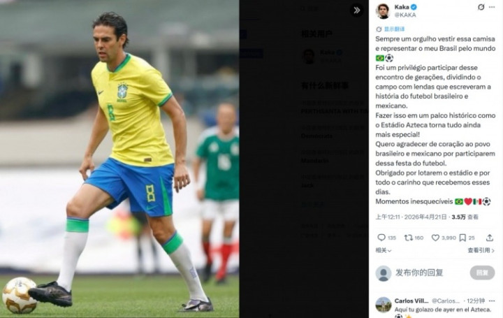 直播吧4月21日讯巴西外传队对阵墨西哥外传队的比赛,前者以2-3的比分落败。本场比赛,桑巴外传卡卡首发出战打进1球。赛后,他在酬酢媒体上对球迷暗示了感谢。