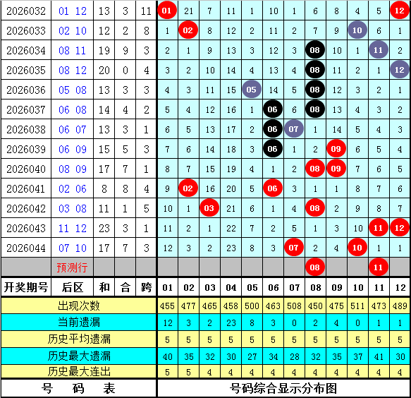 石浩第2026045期大乐透后划分析:后区上周星期一后区奖号为03和08,上期开出奖号07和10,最近9周星期一与最近9期后区奖号奇偶比分别为9:9和7:11,大小比分别为10:8和11:7,本期后区防御全大组合,参考号码08、09、10、11。