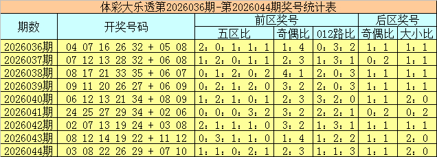 体彩大乐透第2026044期奖号为03 08 22 26 29 + 07 10,前区号码五区比为1:1:0:2:1,奇偶比为2:3,012路比为1:1:3,后区号码奇偶比为1:1,大小比为2:0。
