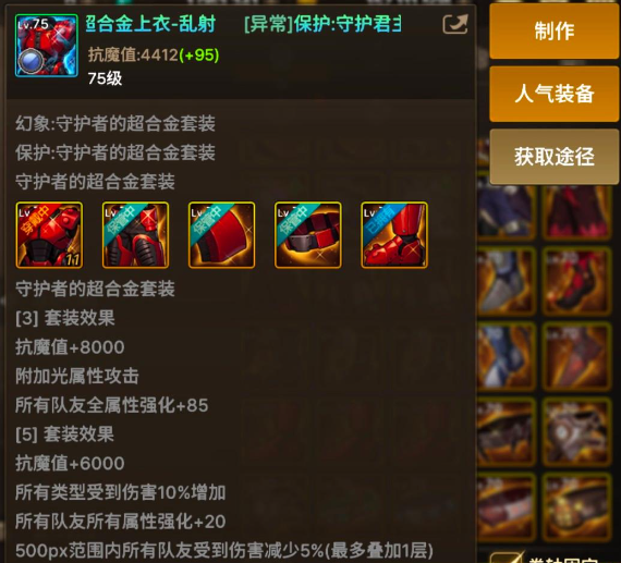 另外隔壁服还有一套堪称是万金油的史诗套,这套守护合金套可以增加队友大量的属强,这对于混子玩家和辅助玩家来说这算是毕业套装了,带上这套装备能轻松混团。