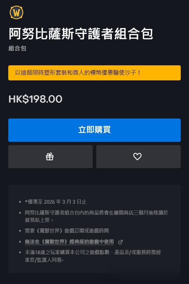 最后说一句,这个礼包不是国服特供,暴雪今天在全球直营服同步上架了该礼包,美服售价25美元(约173人民币),亚服售价198港币(约合人民176元),国服依然是全球服务器里定价最低的服务器。