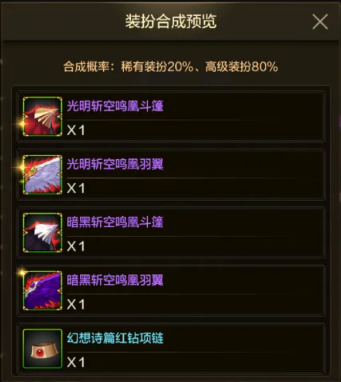 可以看到这次天5的合成几率同样是不高的,只有20%的概率,也就是说大家要想合出一套天五那得花费不小的代价才行。不过对于拥有往期老天空套的玩家来说这次是真的不用合天5了,这次大家可以用第一期到第四期的天空套进行升级获得天五。而升级的费用和以往的活动一样,一件老天空加上一个合成器和一件高级时装就能升级成功。而最近也是送了不少高级时装的,合成器也是可以直接到拍卖行购买,这相当于大家可以直接免费升级获得到一套天五。而且不想要升级天五的玩家也别担心,这游戏后期版本也是会上线不少更有意思的时装的。