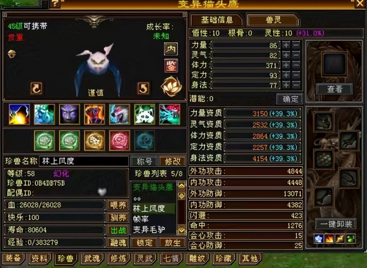 当然了,要想实力强,还得高兽灵。像目前主流49玩家的PK珍兽一样,这个号的PK宝宝是双十4000+的猫头鹰,兽灵等级高达69级!