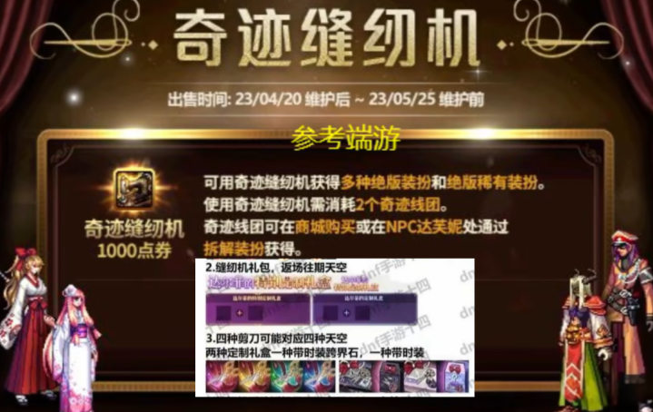 而刃影玩家也别担心,4号不出意外还会上线缝纫机活动,根据十四的拆包发现缝纫机礼包也是出现了,会返场往期的天空套。而另外还从拆包中发现了四种剪刀,而这个剪刀材料估计就是缝纫机活动的必备材料了。参考端游的缝纫机活动来看,大家通过这个活动可以获得到以往的绝版时装和绝版天空套。