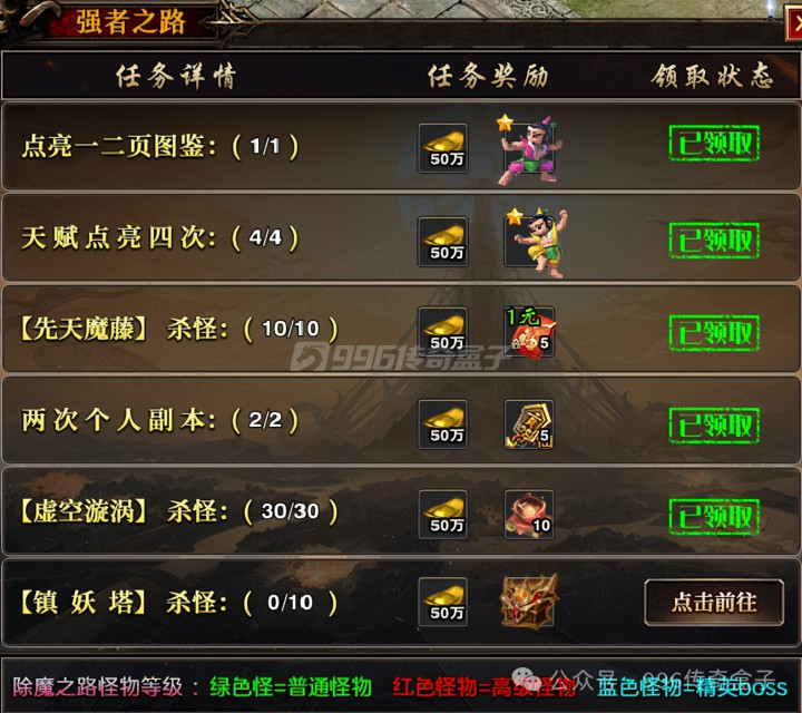没有任何引导,王者试炼就是主线任务,跟着王者试炼走就能发育起号,熟悉一些重要升级功能玩法。每完成一个任务都会有任务奖励。每击杀一百只怪,能领取一颗人参果,拥有十颗人参果就能进行一次抽奖,有概率抽到代金券哦!抽奖可以获得积分,积分可以去积分商城兑换材料、属性和时装!