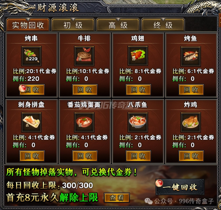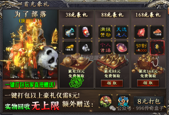 实物回收很重要,就是右上角的财源滚滚。打怪掉落实物,八元开通首充后,回收实物就没有上限了。实物掉落概率很大,回收可以按比例获得代金券,代金券可以用来购买在线充值的礼包。散人不开通首充只能回收三百个实物,大概只能购买十元的礼包,首充开通后,换到的代金券不要一个一个买礼包,这样不划算,可以直接攒168代金券一键打包所有,还会额外赠送时装和专属好礼!