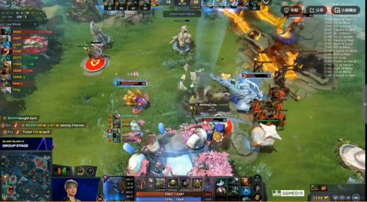 [41分钟]XG抱团开雾找机会,从下路摸上高地绕后,Fy蝙蝠先手拉两个,BOOM酒仙被秒交出买活!后续Ame蚂蚁输出一套爆发直接秒掉电魂,买活的BOOM酒仙开大跑路还是被小小丢回!XG完成团灭结束比赛!拿下小组赛开门红!