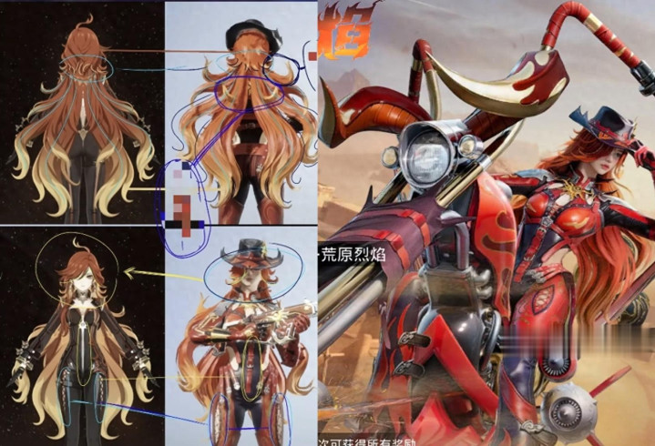 皮衣这个元素没啥好说的,但这美术配色和头发的渐变颜色都完全照搬就有点说不过去了,甚至头发的分叉方向都一样。而且大腿那还专门抄了一个一模一样的镂空,保留了原来的味道。