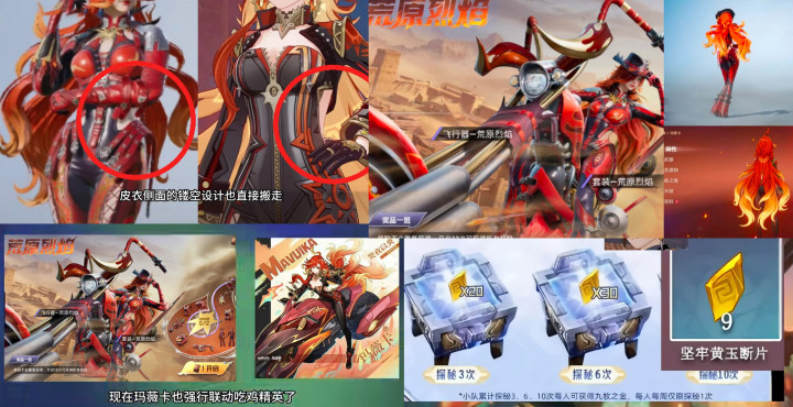 而且不仅是火神玛薇卡,就连申鹤和爱可菲的服装也都有被借鉴。回头想想还是蛮有意思的,当时火神玛薇卡一出来,各个论坛上不是在吐槽割裂,就是在吐槽玛薇卡的机车皮裤难看。现在看来的话,火神玛薇卡的角色形象非常成功,毕竟除了小明同学的奥古斯塔之外,谁能想到和平精英这款超人气手游也出一个同款皮肤呢?真是一问全在喷,一看全在致敬。
