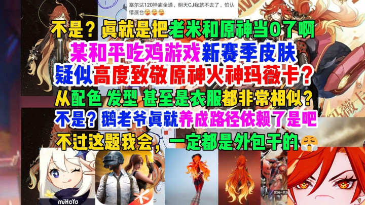 最后只能说米哈游这波是真成业界素材库了,前阵子王者刚刚把原神的岩元素突破素材改名就用,某开放世界游戏地图也是原汁原味,现在玛薇卡也强行联动吃鸡精英了,只能说公用素材库的含金量依然在上升,大家觉得呢?