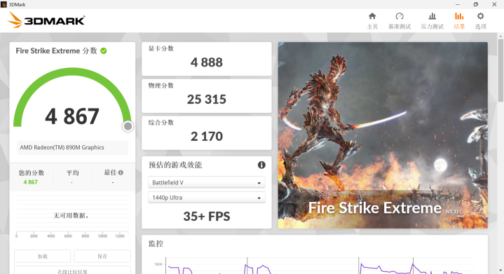 在3DMark中进行基准测试,基于DX11的Fire Strike Extreme测试中,ROG Xbox 掌机X取得了4888分的图形分数。