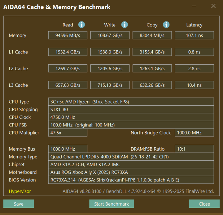 内存方面,这次标配24GB LPDDR5X 8000MT/s内存。通过AIDA64的跑分结果来看,读取速度极快,延迟控制在110ns左右。给核显划分显存的时候那叫一个豪横,直接划8G甚至12G都不心疼,有效缓解了以前爆显存导致掉帧的问题