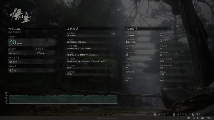 比如大家都在玩的《黑神话:悟空》,在1080P低画质开启FSR的情况下,初代Ally可能在激烈的Boss战里会掉到40帧以下,但这台新机器却能在中画质稳在50-60帧的水平。