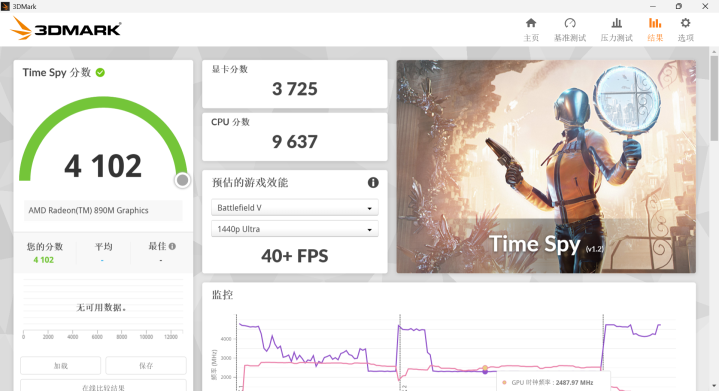 在基于DX12的Time Spy测试中,这台机器的总分居然摸到了4100分的大关,图形分数也在3725分左右。