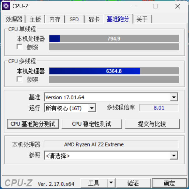 在CPU-Z测试标准下,这台机器的单核得分794.9分,多核得分6300分左右。