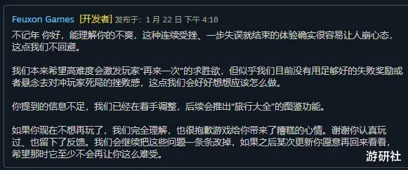不过我还是看好这款游戏,因为在面对批评后,开发者也没有丝毫回避,直言了自己在难度设计上的失误,并且承诺了会着手调整,逐渐改进游戏体验。这样诚恳的态度和本身有一定改进空间的游戏框架,我觉得《灾厄之石》值得玩家暂时的等待。