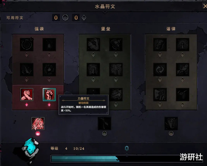 通过一次次死亡,可以获得经验值强化水晶符文,解锁不同分支的增益