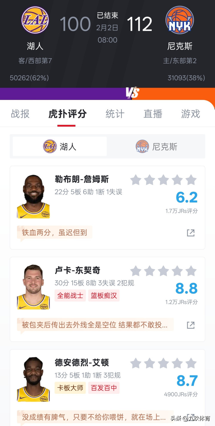 北京时间2月2日,在一场NBA常规赛焦点对战中,湖人队以100-112惨败尼克斯。本场比赛湖人41岁巨星詹姆斯又让球迷失望了,最后1分30秒上演铁血两分,直接终结比赛悬念,赛后1.7万人给詹姆斯打出6.2分的低分,让人倍感唏嘘。