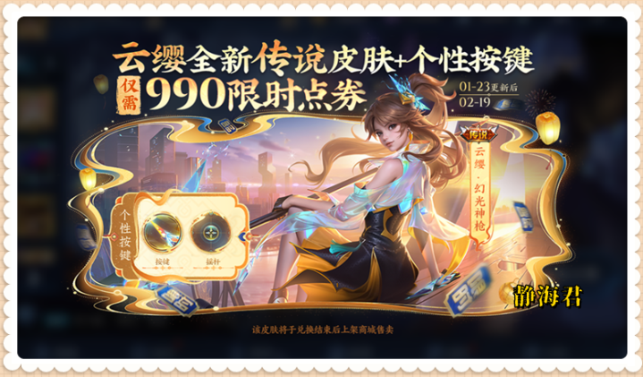 当时配合限时点券活动上线的,亚搏app下载还有云缨全新传说皮肤990限时点券直接兑活动,如果我没猜错的话,今年大概率还会有类似的活动(到时候又有玩家会在一个新传说皮肤,和几个老皮肤之间纠结了)。