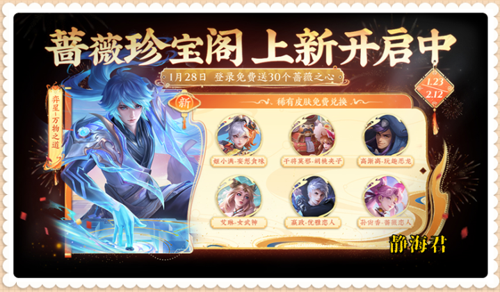 {jz:field.toptypename/}去年春节期间,策划在蔷薇珍宝阁上线了弈星的万物之道皮肤(兑换价格依旧是150个蔷薇之心),不知道今年会不会有惊喜。