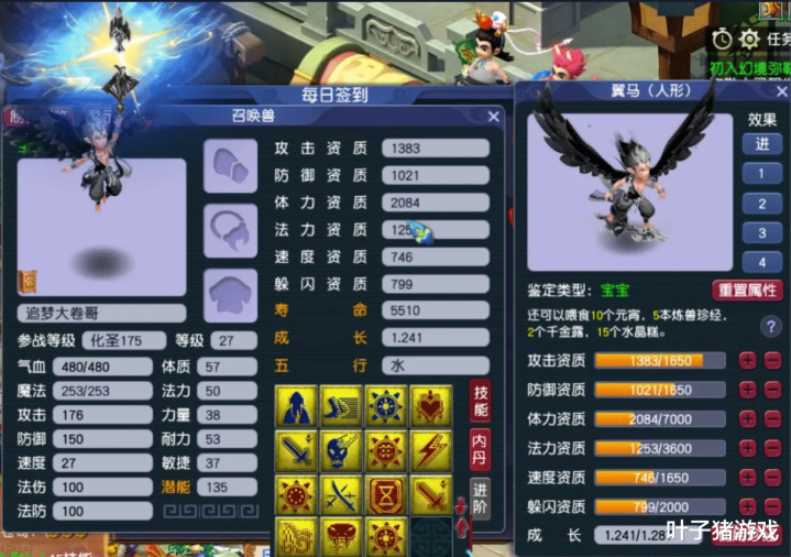 最终结果格外亮眼——不仅成功合出翻页技能,更保留了主宠造型,且资质与面板均属实用,堪称当前全服第一只人形翼马胚子。若后续能顺利打上完美的四小法搭配四精通技能,便可考虑接续使用须弥真言兽诀进行打造。