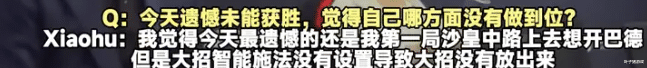 而在赛后xiaohu把这次失误归咎于大招智能施法没有设置,那么问题来了,比赛开打前不是给选手时间去调试设备吗?既然能上赛场就要认真对待,星空体育这是一名职业选手的基本素养。