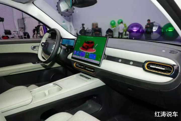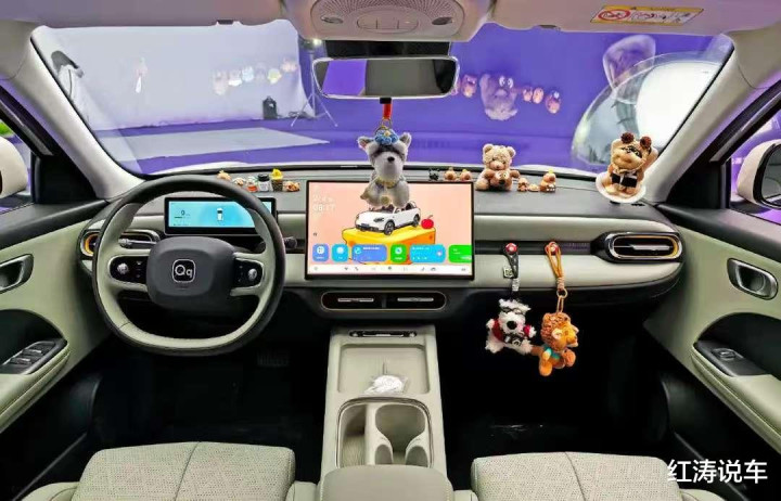 奇瑞QQ3EV的内饰设计以及配色都营造出时尚和精致氛围,多层次感的中控台上配备15.6英寸2.5K悬浮式中控屏、10.25英寸矩形仪表屏,并搭载AI灵犀座舱系统,车机内置高通8155车机芯片,支持Carmind智能体、Carplay/Hicar/Carlink互联、多场景模式等功能,同时UI采用多色彩感的椭圆形元素。