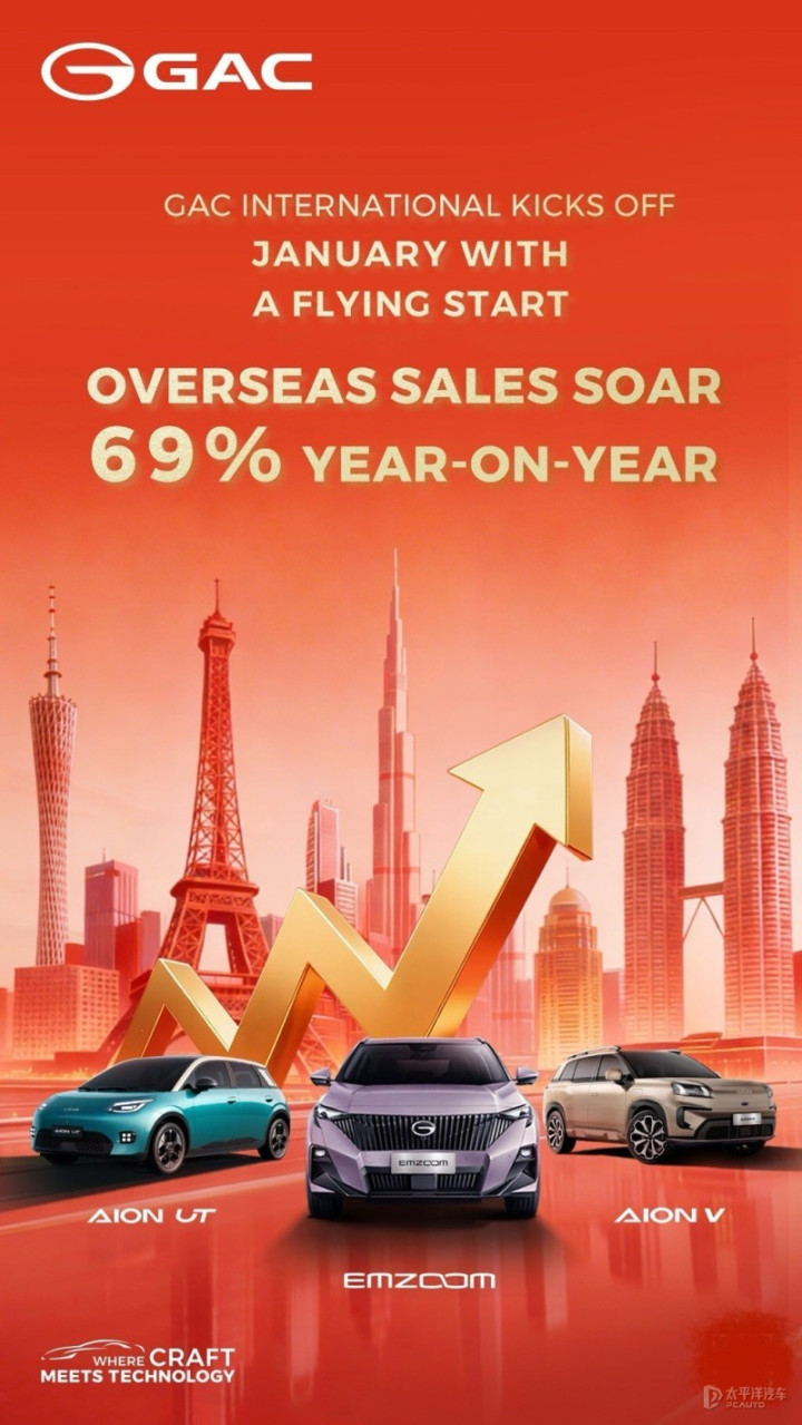 2026年伊始,广汽出海业务迎来“开门红”:1月广汽国际海外销量同比大涨69%,不仅延续了前两年的跨越式增长态势,更为全年“冲刺30万台”的海外销量目标奠定了坚实基础。其中,明星车型AIONV表现亮眼,创下其海外上市以来的月度终端销量新高,成为销量增长的重要推手。