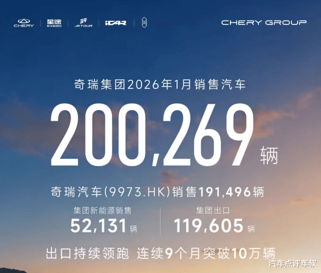 奇瑞集团的20.03万辆排在第三,虽然同比下滑10.7%,但亮点依然突出。其中,新能源汽车贡献5.21万辆,占总销量26%,这一成绩与集团2025年新能源销量90.38万辆、同比增长54.9%的强势表现一脉相承,为2026年冲击更高目标奠定基础。出口量达11.96万辆,占总销量近60%,同比增长48.1%,连续9个月单月出口突破10万辆大关,全球化战略再获突破性进展。