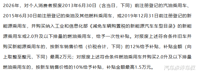 但更重要的影响在于以旧换新补贴的调整。2026年的汽车以旧换新补贴从定额改为按新车售价比例计算:个人报废更新新能源乘用车可获车价12%补贴(最高2万元),2.0升及以下燃油乘用车可获10%补贴(最高1.5万元)。这意味着靠政策驱动的低价新能源市场,将面临深度调整,而15~20万元的主流市场将成为新的战场。