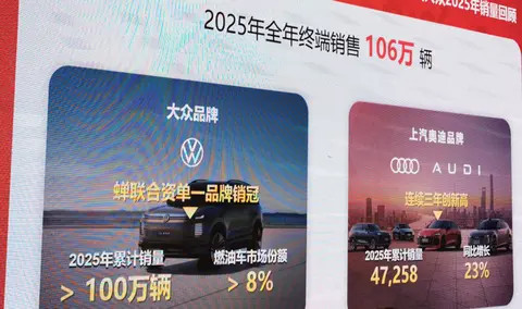 到2025年收官,经历了“价格战、无序竞争、过度营销”的洪流后,上汽大众达成年度目标,全年终端销售106万辆,依旧是年销“百万俱乐部”成员。其中,大众品牌燃油车市占率攀升至近8.3%,持续位居单一品牌燃油车市场第一。上汽奥迪年销4.7万辆,同比增长23%。