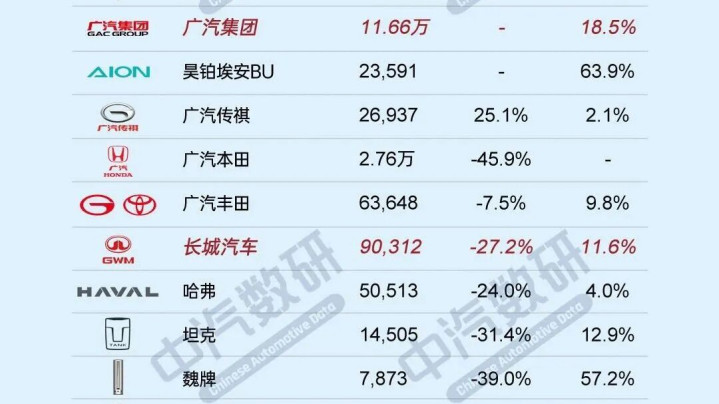 再从环比角度看,环比下滑在0到-50%之间的车企包括,比亚迪集团(-50%)、奇瑞集团(-18.2%)、鸿蒙智行(-35.3%)、小米汽车(-22%)、零跑汽车(-46.9%)、理想汽车(-37.47%)、蔚来集团(-38.5%)、小鹏汽车的(-46.65%)。