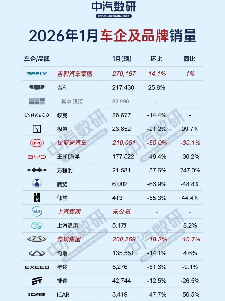 目前,公布销量的汽车品牌已经接近30家,整体的结论是,因为2025年1月下旬已经进入春节,而2026年的1月是完整的销售自然月,所以同比数据的含金量相对较低,而环比数据里,只要下滑低于50%就值得一个点赞。