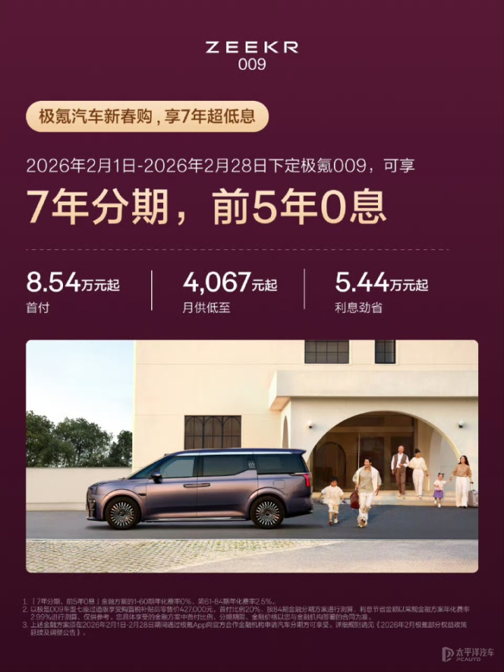 其中,极氪 007/007 GT/009可享7年超低息,只要在2月1日-2月28日下定可享7年分期,其中1-60 期年化费率0%,第61-84期年化费率2.5%。