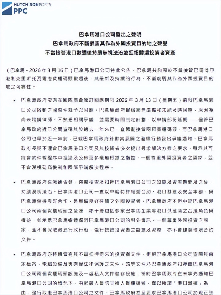 周四晚些时候,巴拿马政府还进一步发布官方声明,宣称该公司在口岸筹划权布置过程中,遥隔离离与政府进行灵验相助,刻意瞒哄口岸运营有关中枢信息,况兼坏心防止两边商定的和谐过渡责任,给口岸的平常运营带来了负面影响。并称PPC近期的一系列言论“存在严重造作,且已组成对巴拿马政府的贬低”,将保留根究其法律包袱的权柄。