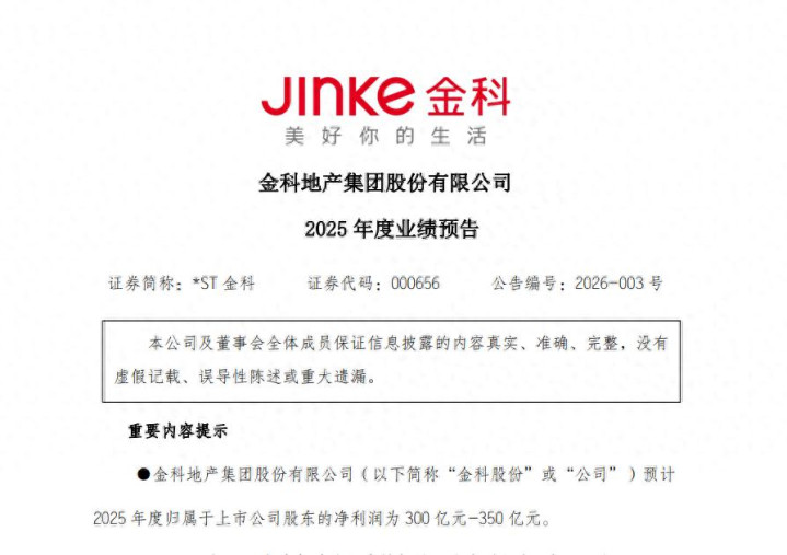 乐居财经 李兰1月30日,*ST金科(000656.SZ)发布2025年度业绩预告,预计归属上市公司股东的净利润将实现300亿元至350亿元,同比扭亏为盈。同时,归属上市公司股东的所有者权益已由负转正,预计在50亿元至70亿元。