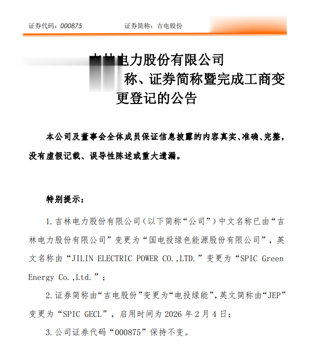 证券简称由“吉电股份”变更为“电投绿能”,启用时间为2026年2月4日,证券代码“000875”保持不变。