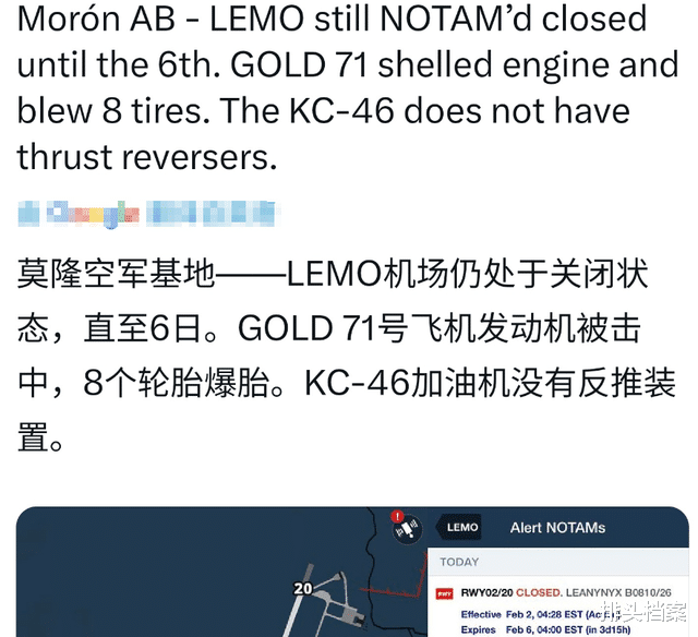 据外媒报道,地处西班牙南部的莫龙空军基地发布公告称,机场将暂时关闭,关闭时间持续至本月6日。究其原因,1架美国空军的KC-46A空中加油机在该机场滑跑起飞时,因发动机出现故障而采取紧急中止起飞的操作。在这一过程中,加油机2具主起落架上的8个轮胎疑似全部爆胎。由于跑道清空作业无法快速完成,故不得暂时关闭,以及可能导致多架飞机被迫滞留。