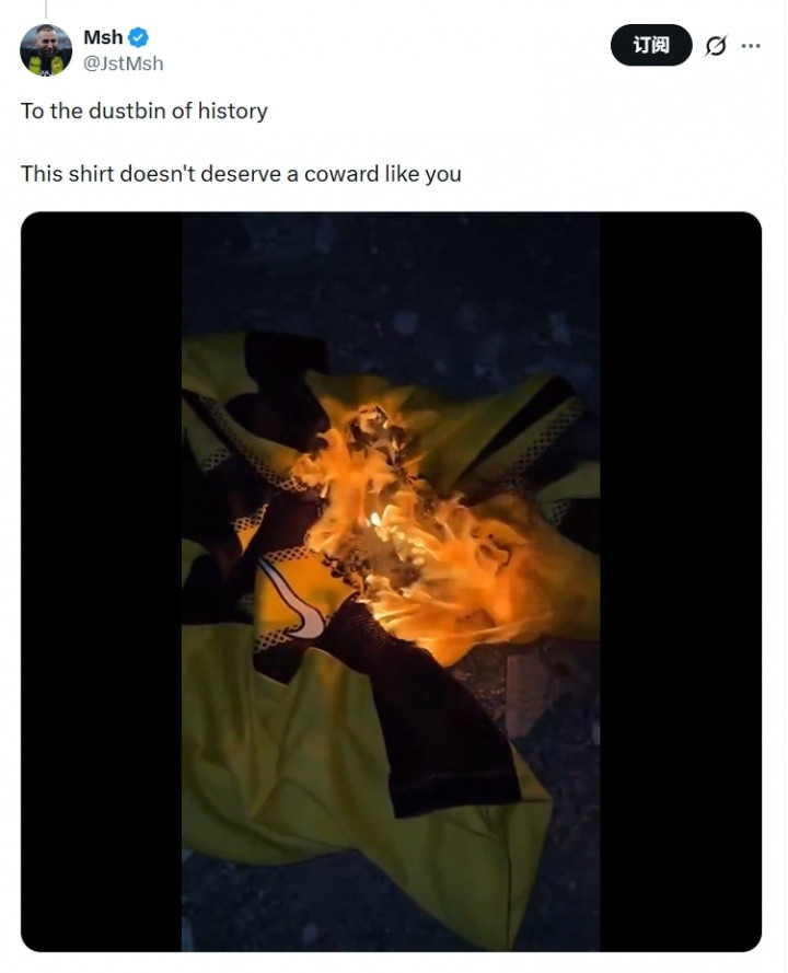 直播吧02月03日讯本泽马从吉达联合转会至另一支沙特联球队利雅得新月,一名吉达联合球迷为此非常愤怒,星空体育直接烧掉了本泽马的球衣。
