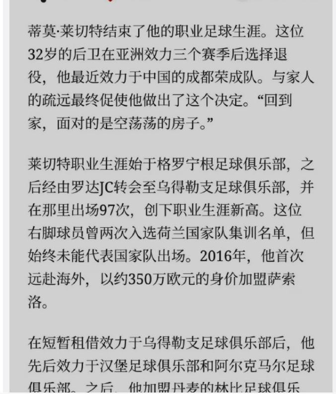 刚在中超踢出名堂,32岁就宣布退役?前成都蓉城后卫莱切特这一操作,直接把球迷整懵了!要知道,他在2024年才加盟成都,65场比赛7球4助攻,数据比不少前锋还猛!按实力,2025赛季他妥妥是中超第一中卫,结果现在说走就走,连个“缓冲期”都不给,这背后,到底藏着什么猫腻?