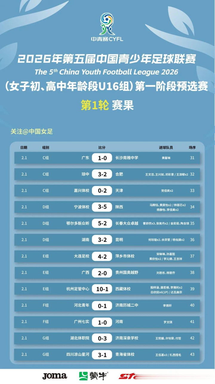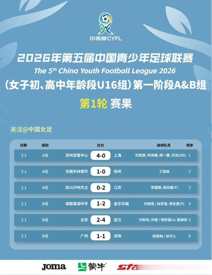2026年第五届中国青少年足球联赛女子初、高中年龄段U16组第一阶段比赛在云南泸西开赛。第1轮赛果信息如下: