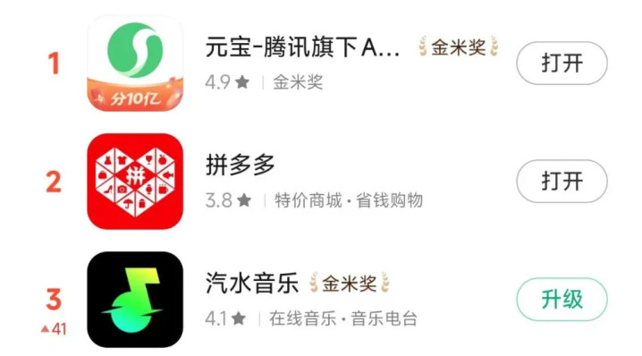 图为:冲上应用商城飙升榜第一的“元宝”