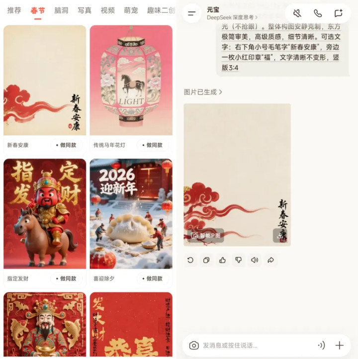 刚好用元宝一键做出来的同款春节海报,可以让爹妈发朋友圈。