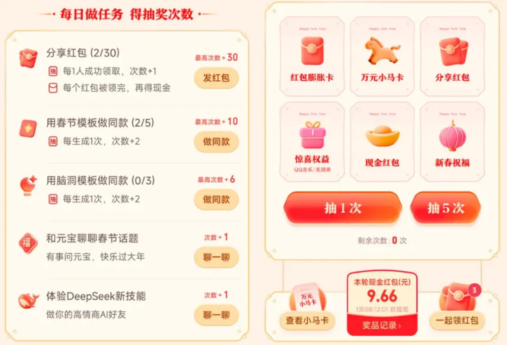 参与者每天通过做任务,比如分享红包、用春节模板做同款、用脑洞模板做同款、和元宝聊聊春节话题、体验DeepSeek新技能等来获取抽奖机会。