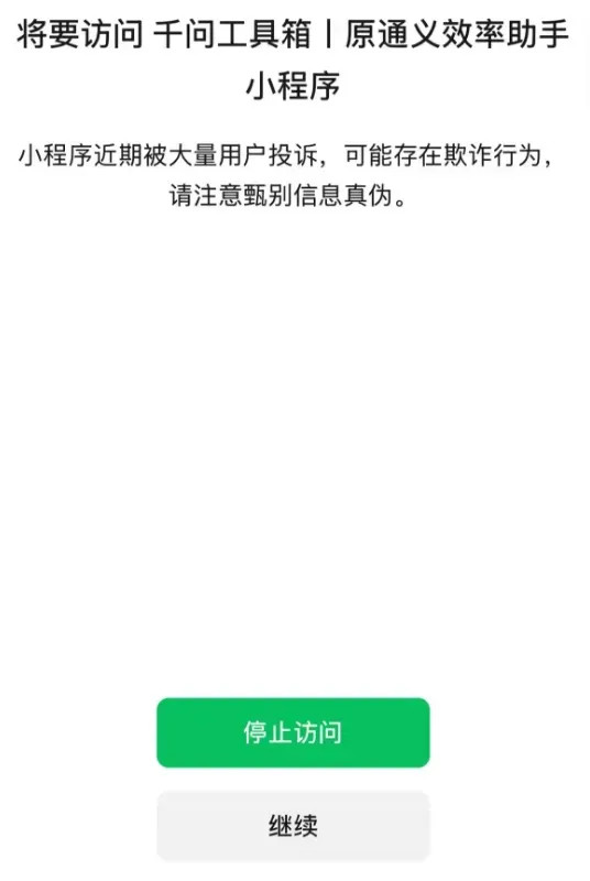 在微信聊天里分享元宝链接可以直接跳转,但想要访问千问工具箱小程序则被警告“可能存在欺诈”。